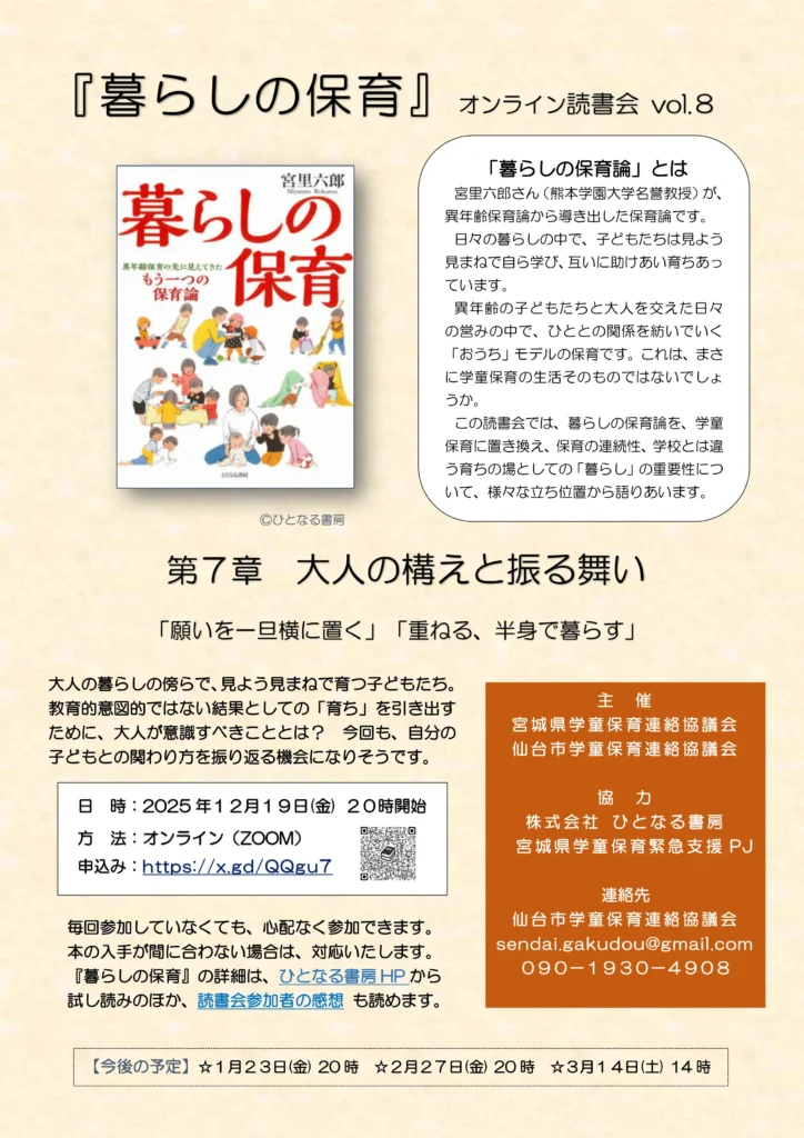 学童保育は異年齢の子どもたちが育つ「生活の場」。「暮らしの保育」という新しい保育論を学童保育の視点から読み解こう という読書会です。