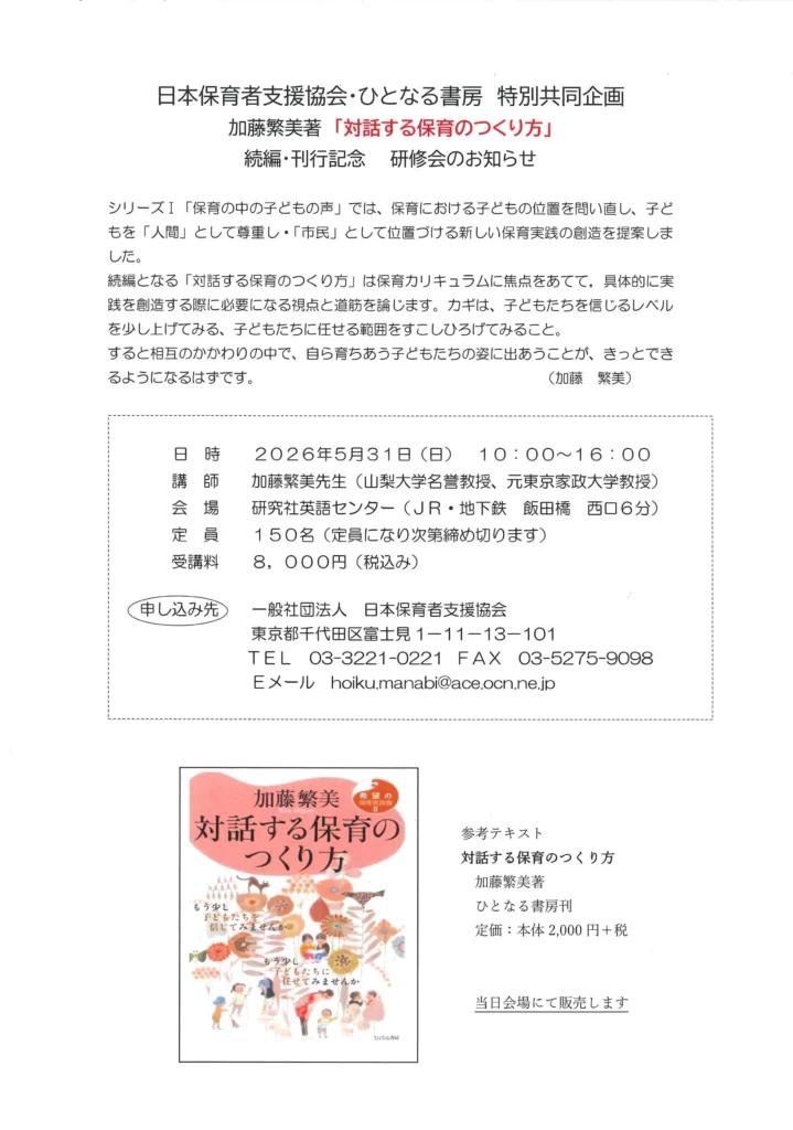 日本保育者支援協会様とひとなる書房の共同で、「『対話する保育のつくり方』続編刊行記念研修会を企画しました。ぜひお申し込みください。