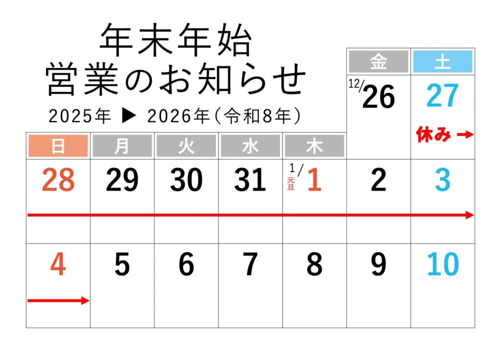 年末年始休業期間:2025年12月27日(土)~2025年1月4日(日)